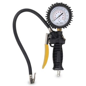 Wer ein zuverlässiges, robustes und günstiges Reifenfüll-Messgerät für Heim und Hobby sucht, ist mit diesem powerplusAIR-Modell Nummer 102 gut beraten. Eine übersichtliche Manometer-Skala mit knapp 10 cm Durchmesser im stoßfesten Schutzmantel aus Gummi zeigt Reifendruck bis zu 12 bar an und ist damit für fast alle Reifentypen geeignet. Bedient wird der rund 600 Gramm leichte powerplusAIR Reifenfüller mit einer Hand über einen metallenen Hebel. Das Handstück selbst ist aus robustem, ergonomisch geformtem Hartgummi mit Profilrillen gefertigt und gerät auch bei nassen oder schmierigen Händen nicht ins Rutschen – diese Rillen sind allerdings auch etwas schwerer sauber zu halten als bei durchgängig gearbeiteten Griffen. Befüllt und gemessen wird der Luftdruck dann über einen gut 33 cm langen, flexiblen Füllschlauch mit gerader Euro-Schnellverschlusskupplung. Dieser Ventilanschluss ist auf den meisten Ventilen schnell angebracht und fällt dabei positiv mit seiner Dichtigkeit auf. Auch das Manometer kann mit guter Genauigkeit für den Heimbereich überzeugen.| Besonderheiten | Günstiges Einsteigermodell |